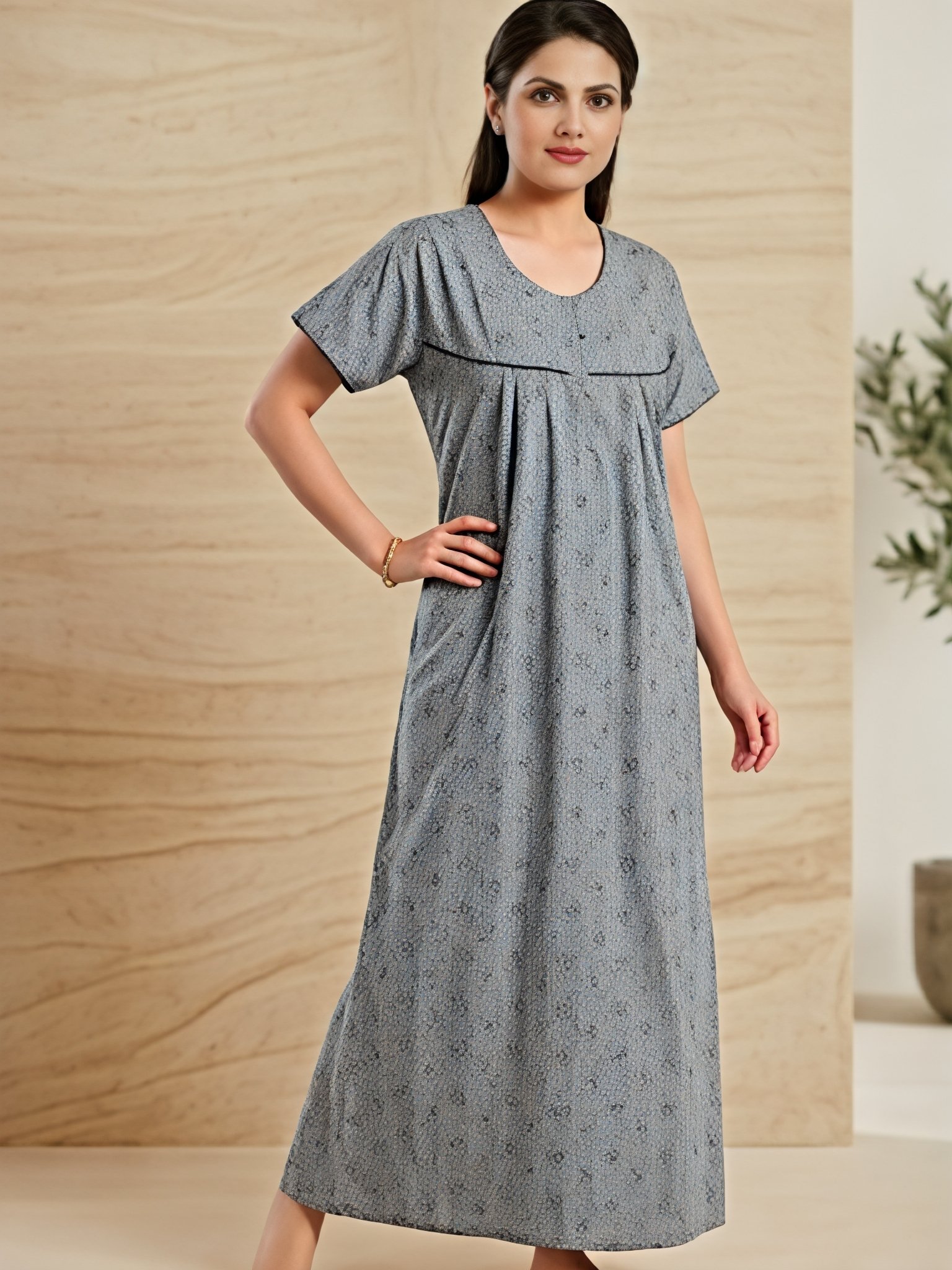 Enjoy unmatched comfort with this premium women’s cotton nighty, designed for relaxed everyday wear. Crafted from soft, breathable fabric, this night dress features a subtle all-over print with a modern yoke design that adds a touch of elegance.