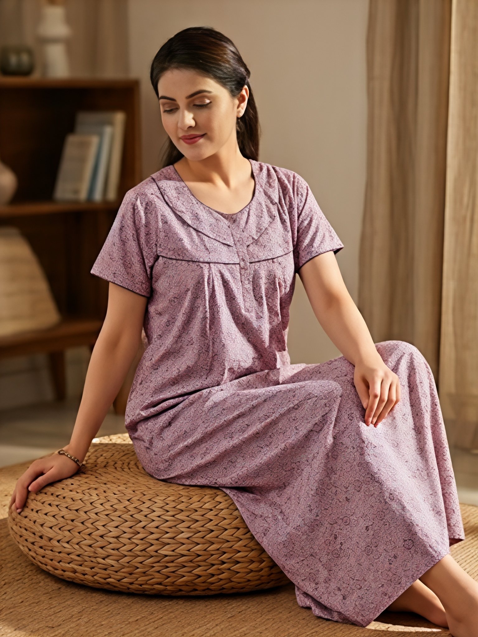 Available in multiple soothing colors like grey, pink, and brown, this nighty offers a loose and airy fit, ensuring maximum comfort throughout the day and night. Whether you’re relaxing at home or getting a good night’s sleep, this lightweight and skin-friendly outfit is a perfect choice.